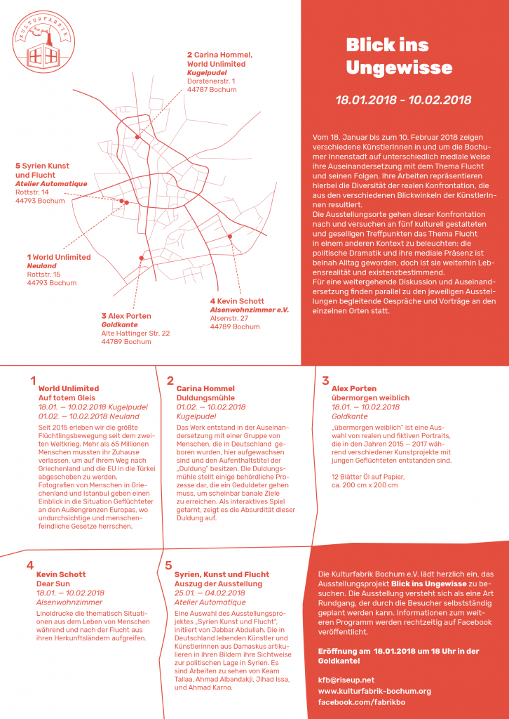 Vom 18. Januar bis zum 10. Februar 2018 zeigen verschiedene KünstlerInnen in und um die Bochumer Innenstadt auf unterschiedlich mediale Weise ihre Auseinandersetzung mit dem Thema Flucht und seinen Folgen. Ihre Arbeiten repräsentieren hierbei die Diversität der realen Konfrontation, die aus den verschiedenen Blickwinkeln der KünstlerInnen resultiert.