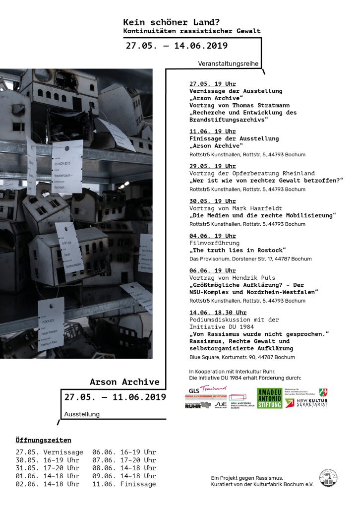 Bezugs- und Ausgangspunkt dafür wird das „Arson Archive“ sein. Das Archiv ist eine Installation des Informationsdesigners Thomas Stratmann, in welcher Brandanschläge auf Einwanderer- und Flüchtlingsunterkünfte seit der deutschen Wiedervereinigung gesammelt und wirkungsvoll sichtbar gemacht wurden.