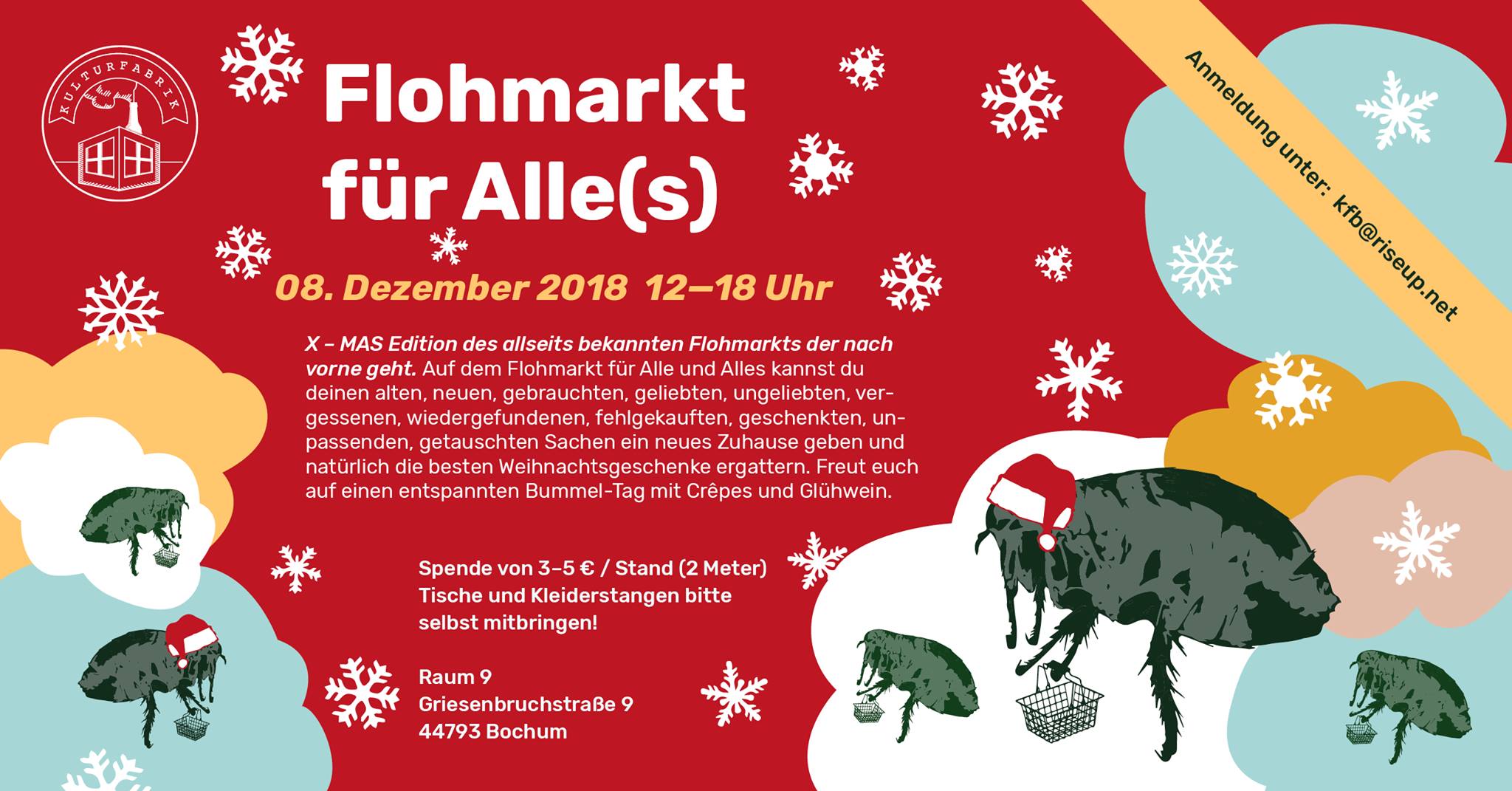 X – MAS Edition des allseits bekannten Flohmarkts der nach vorne geht. Auf dem Flohmarkt für Alle und Alles kannst du deinen alten, neuen, gebrauchten, geliebten, ungeliebten, vergessenen, wiedergefundenen, fehlgekauften, geschenkten, unpassenden, getauschten Sachen ein neues Zuhause geben und natürlich die besten Weihnachtsgeschenke ergattern. Freut euch auf einen entspannten Bummel-Tag mit Crêpes und Glühwein.