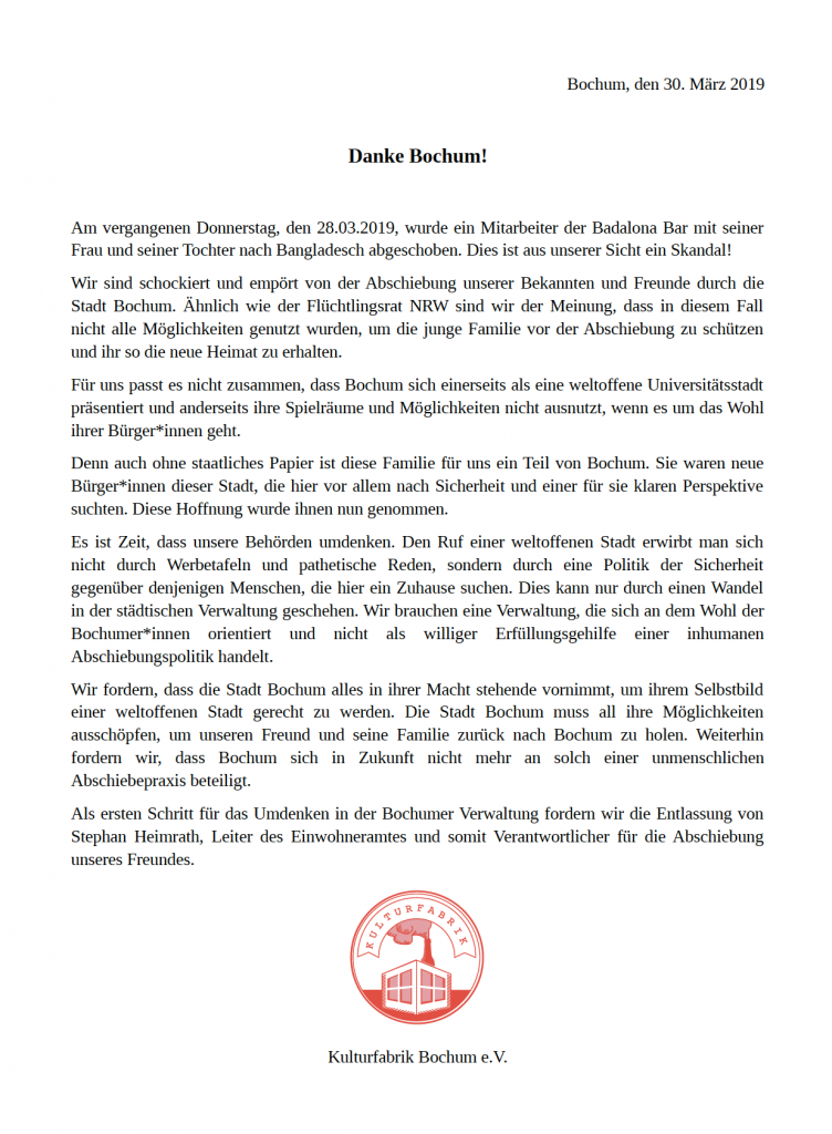 Forderungen an den Bochumer Rat und an die Bundesregierung: